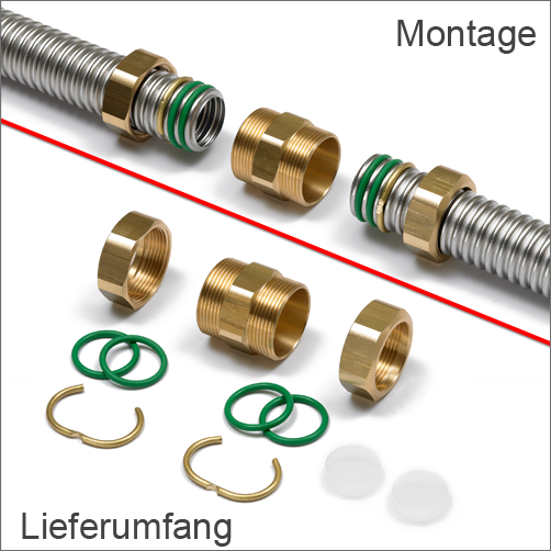 mit 4 O-Ringen dichtend, 2 Klemmring und 2 x Überwurfmutter.